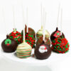Make any celebration this winter brighter with these decadent treats! We’ve taken rounds of our signature chocolate and vanilla cakes and dipped them by hand into baths of irresistibly smooth Belgian chocolate. Each pop is then festively embellished with stocking-shaped candies, bright sprinkles, or ribbons of silky chocolate confection.