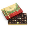 The perfect gift for the holidays, our Limited Edition Assorted Chocolate Holiday Gift Box tied with a gold ribbon features nine of our favorite Godiva chocolates in milk chocolate, dark chocolate, and white chocolate with luscious Belgian fillings — velvety ganaches, creamy pralinés, silky caramels, and delicious fruits, and nuts — in exciting flavors and satisfying textures. This beautiful box with limited edition red, gold and green garland design and gold ribbon is a truly special chocolate gift for the season.