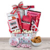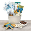 California white wine and gourmet goodies are all decked out in a happy holidays gift basket!