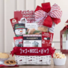 Combined with chocolate brownie, soft nougat fruit and nut bites, Hammond’s lemon cakes, Lindt Lindor milk chocolate truffle balls, vanilla fudge with sea salt, Red Thread chocolate chip cookies, caramel popcorn, Hamilton House cookies with chocolate filling and pasties with a beautiful basket with peace liner.Gift Size: 17″ x 8″ x 11″