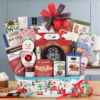 With Godiva and Lindt milk chocolate truffles, kettle corn, dark chocolate peppermint truffles, Ghirardelli milk and dark chocolate peppermint bark, olives, Valley Lahvosh baked sesame crackers, smoked Gouda cheese spread, cherry strudel cookies, madeleine cakes, cocoa dusted truffles, vanilla wafers and puff pastries, there’s something for everyone in this fun and festive gift basket.Gift Size: 14″ x 9″ x 12″