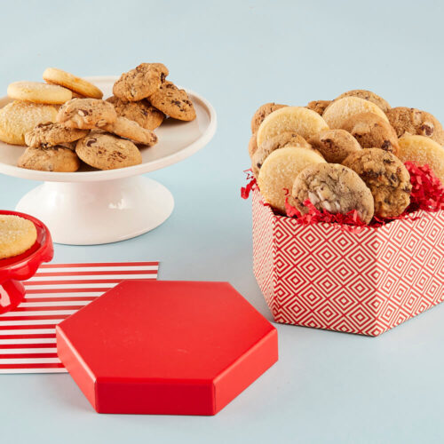 A truly elegant snack experience awaits! This gorgeous wooden chest is hand-crafted and stained to perfection. This gift includes all of our favorites: 10 Gourmet Brownies (Chocolate Truffle, Chocolate Truffle with Walnuts, Marble Cheesecake and Cookies & Cream), 8 Deluxe Sandwich Cookies (Vanilla/Caramel, Vanilla/Hazelnut, Chocolate Chip/Vanilla and Oatmeal/Vanilla), 4 Snack Mixes (Hot ‘n Spicy, Sweet Carolina, Very Berry and Classic Pub Mix) and 6 Gold Foil-Wrapped Hazelnut Chocolates. Please note during the summer months chocolates will be substituted for 4 chocolate chip cookies.