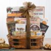 Ghirardelli mint dark chocolate, smoked Gouda cheese spread, sesame crackers, chocolate brownies, spicy honey crunch snack mix, cookies and more round out this classic gift basket.